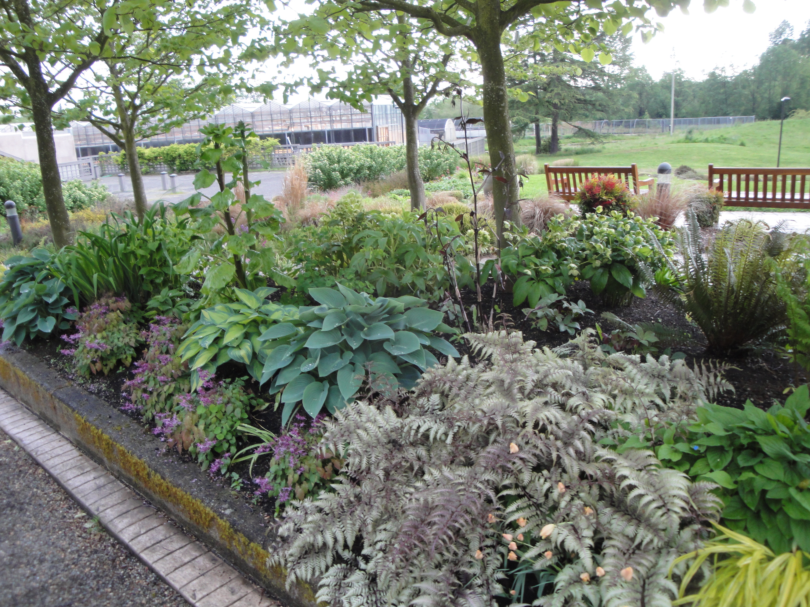 Amidst the chaos of choking weeds and a flurry of events and activities that occur at this time of year, the gardens and the plants themselves somehow manage to put on a tremendous show and visitors are constantly delighted by it all. With our recent changes and game of “musical plants”, the Fragrance Garden is looking fuller and far better defined. It still has a ways to go and a few minor planting schemes have yet to be implemented, but for the most part, plants are more appropriately placed and most everything is thriving very well. The Soest Garden next door continues to be the signature piece of CUH Grounds with its beautiful borders and captivating selection of plants. Bed 7 has got to be the most exciting bed as a jewel box packed with treasures. Epimedium ‘Lilafee’ is absolutely at its peak as are the dramatic stems of Disporum ‘Night Heron’ that seems to draw a lot of attention. We are also expecting the blossoming of a rare variety of the Giant Himalayan Lily (Cardiocrinum giganteum v. yunnanese).
