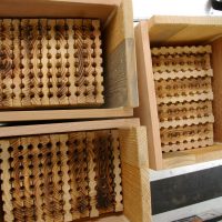 They are not aggressive and they may be observed at very close range without fear of being stung, unless they are handled roughly or if trapped under clothing. In nature, the Mason Bee nests within hollow stems, woodpecker drillings, and insect holes found in trees or wood. Sometimes, there may be dense collections of individual nest holes, but these bees neither connect or share nests, nor help provision or protect each other’s young. Their short foraging range is about 100 yards from the nest. Depending on the weather and available food, activity continues for around four to six weeks and then the adults die.”