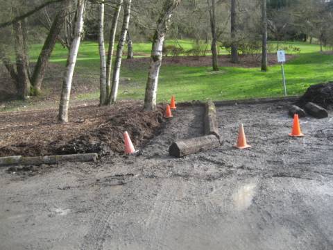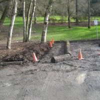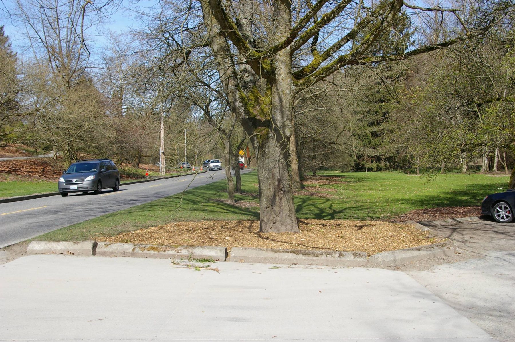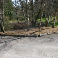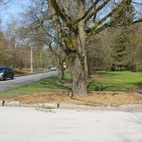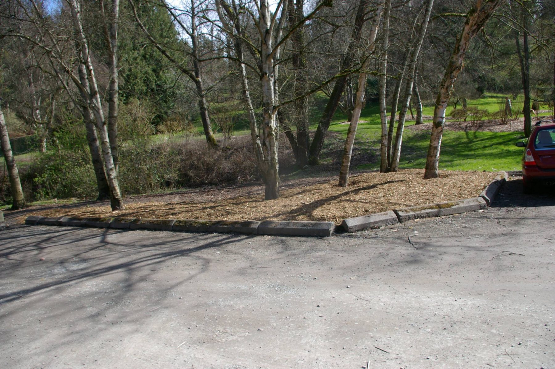 Several trees surrounding the Arboretum’s Boyer Parking Lot have grown up and encroached on the gravel parking spaces. However, because we are advocates for the trees, we decided to make the parking lot yield. A large scarlet oak (Quercus coccinea) and a grove of birch (Betula) were severely impacted by the concrete wheel stops and compacted soil over a large portion of their roots. To remedy the problems, we moved the wheel stops to create a “root protection zone” around the trees. Then, we used compressed air tools to break up the compacted gravel and soil. We amended the soil with mycorrihizae and compost, then topdressed with a thick layer of mulch. If all goes as planned, the additions will stimulate the soil biology, add nutrients and allow roots to grow in the previously uninhabitable environment. Stay tuned for updates.