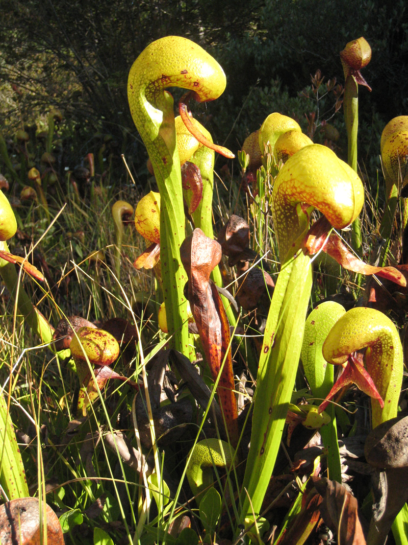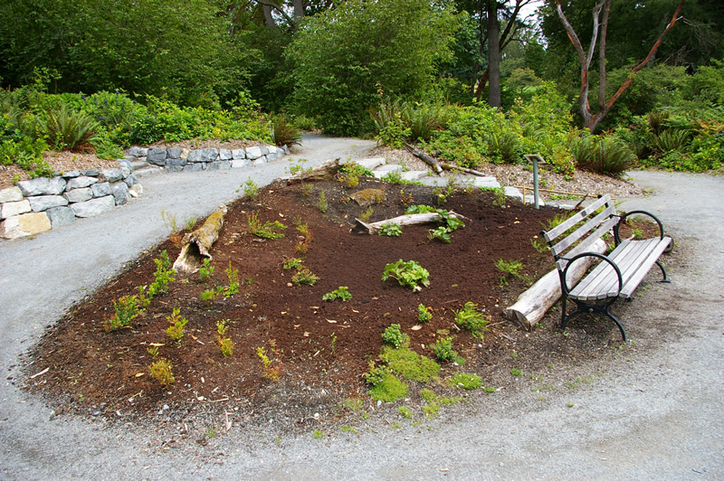 An irrigation system will keep the soil soggy during dry months. Vegetation includes Andromeda polifolia, Ledum glandulosum and Rhododendron occidentale grown from seed collected in the Siskiyou Mountains by Collections Manager Randall Hitchin, and Darlingtonia californica from the UW Botany Greenhouse. Native plants such as huckleberry and maidenhair fern are serving as placeholders while bog plants are being phased in. In addition, the Cascadian Focal Forest contains a Siskiyou seep area along the east side of the first stairway. It too is being phased in and is currently full of container-grown native plants and plants grown from wild-collected seed.