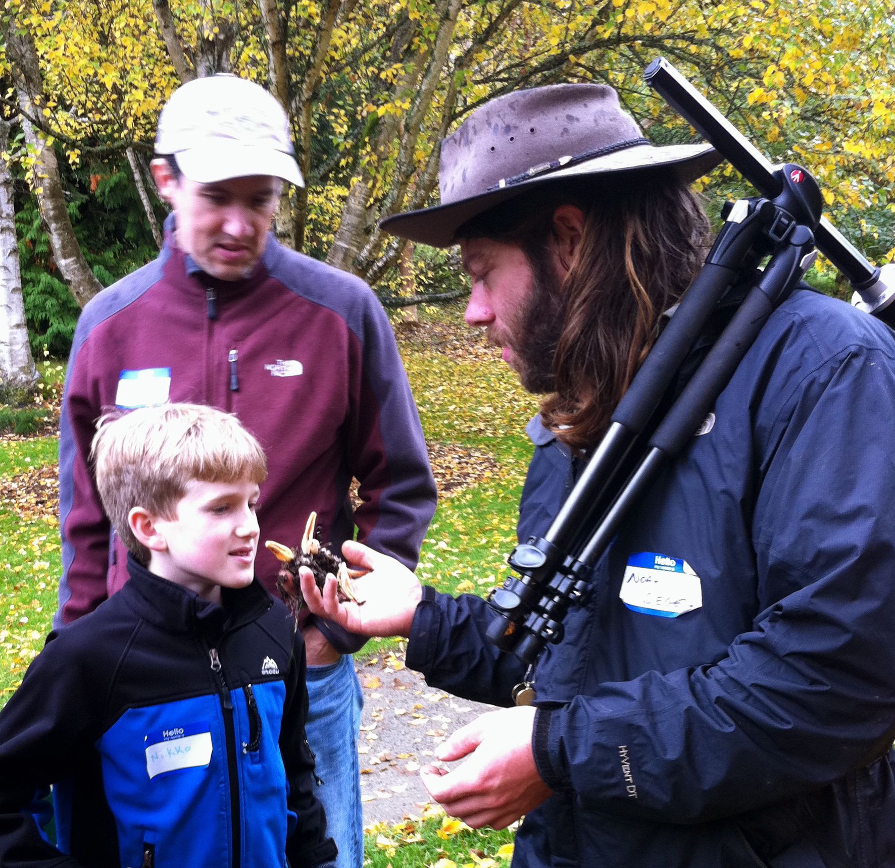 But aside from the obvious appeal to my nature-nerd side, this bioblitz hit me on a human level as well (Gardener’s “interpersonal intelligence”). At one point on Saturday, I found myself on a mushroom team with a pair of traveling mycologist/photographers from Massachusetts, an energetic immigrant from the former Czechoslovakia, a Serbian visiting from Portland, a UW student from the French Alps, a family of four that included two inquisitive young boys, and the daughter of Fujitaro Kubota, of Kubota Gardens. What brought this group together on this predictably soggy but clear fall afternoon? I can’t be sure, but my hunch is that when these people heard about the opportunity to participate in biological inventory of the WPA, it triggered a response from their “naturalist intelligence” and like a moth to a flame could not help but be there. Either that, or they were bored and in the neighborhood.