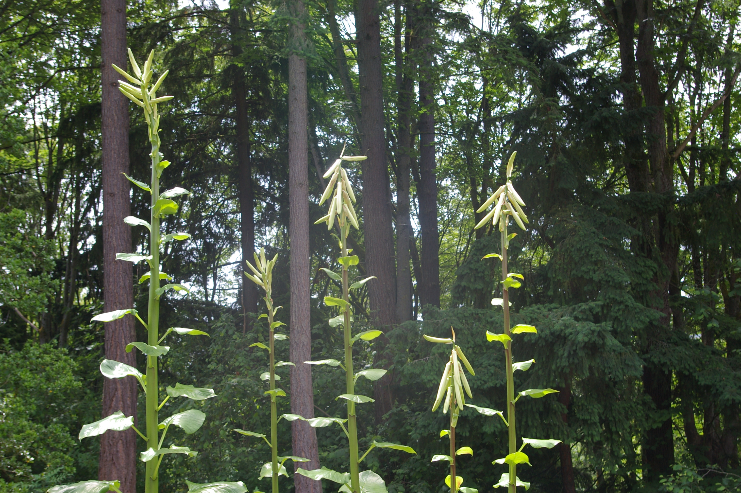 In our special gardens: “Old” as in “they only flower once, set seed and then die”, a condition known as monocarpism. We are fortunate to have 7 giant flowering stalks, of our Cardiocrinum giganteum, Giant Himalayan lilies, ready to open. This is a “do not miss opportunity” found in the China entry garden of Pacific Connections! Don’t delay, check ‘em out today…