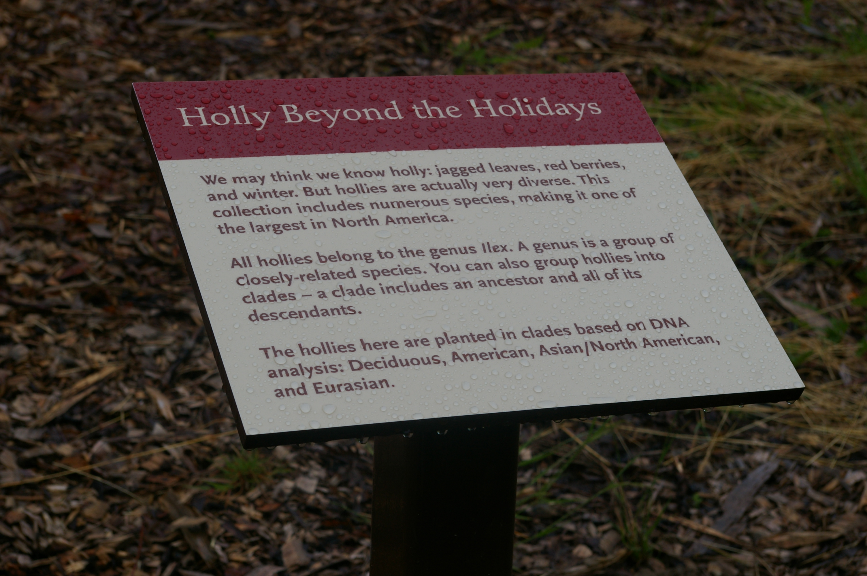 Also, exciting new interpretive signage has been installed in our Winter Garden and Holly collections. Winter Garden signage was funded by Lake Washington Garden Club, Unit III and includes 4 interpretive signs and 1 place ID sign. The holly signage was funded by our partner Century Link Pioneers for their centennial project of 2011 and includes 5 interpretive signs and 1 place ID sign. These new signs follow our 2004 Interpretive and Wayfinding Plan that can be viewed on-line at: http://depts.washington.edu/uwbg/docs/finaliwplan.pdf