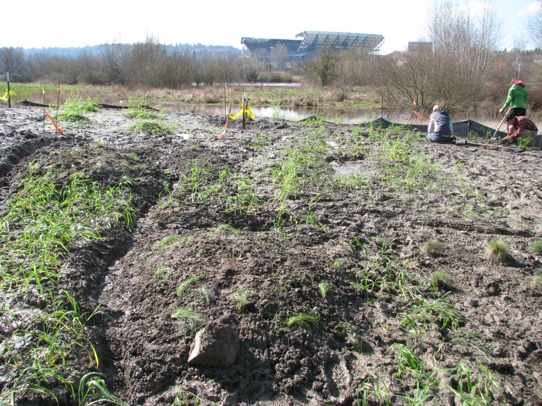 If you have walked around Shoveler’s Pond in the Union Bay Natural Area (Montlake Fill) this month you have seen the area undergoing a flurry of activity from plowing to bulldozers moving dirt. This is all part of the ESRM 473 restoration project. Each winter quarter, students in the class design and implement a restoration project in the Union Bay Natural Area. Previous year projects have included mound construction and prairie plant installation around Shoveler’s Pond, trimming the willows and clearing up the area around the large central pond, wetland construction and prairie conversion of the E5 parking lot.
