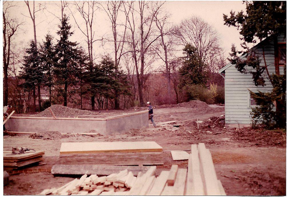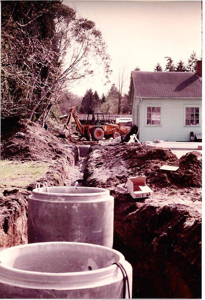 The photographs taken March/April 1985 show sewer work and the building foundation and beginning walls of the storage shed. The new facilities were dedicated in 1986.