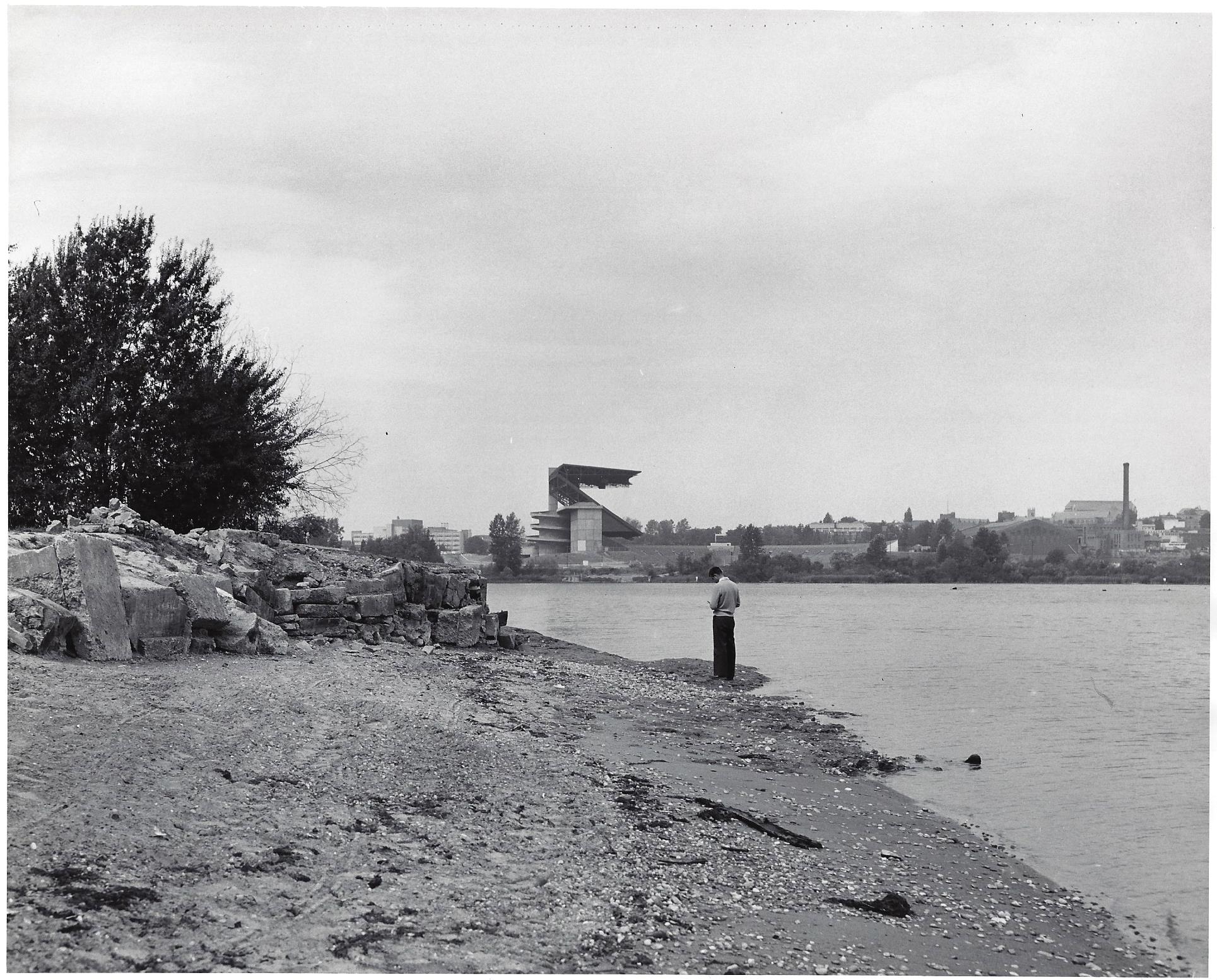 The photograph taken on September 12, 1958, show an extremely low water level on the north end of Foster Island. Currently the water level is usually near the top of the large stone works. The gentleman standing there gives a perspective of at least a six foot drop.