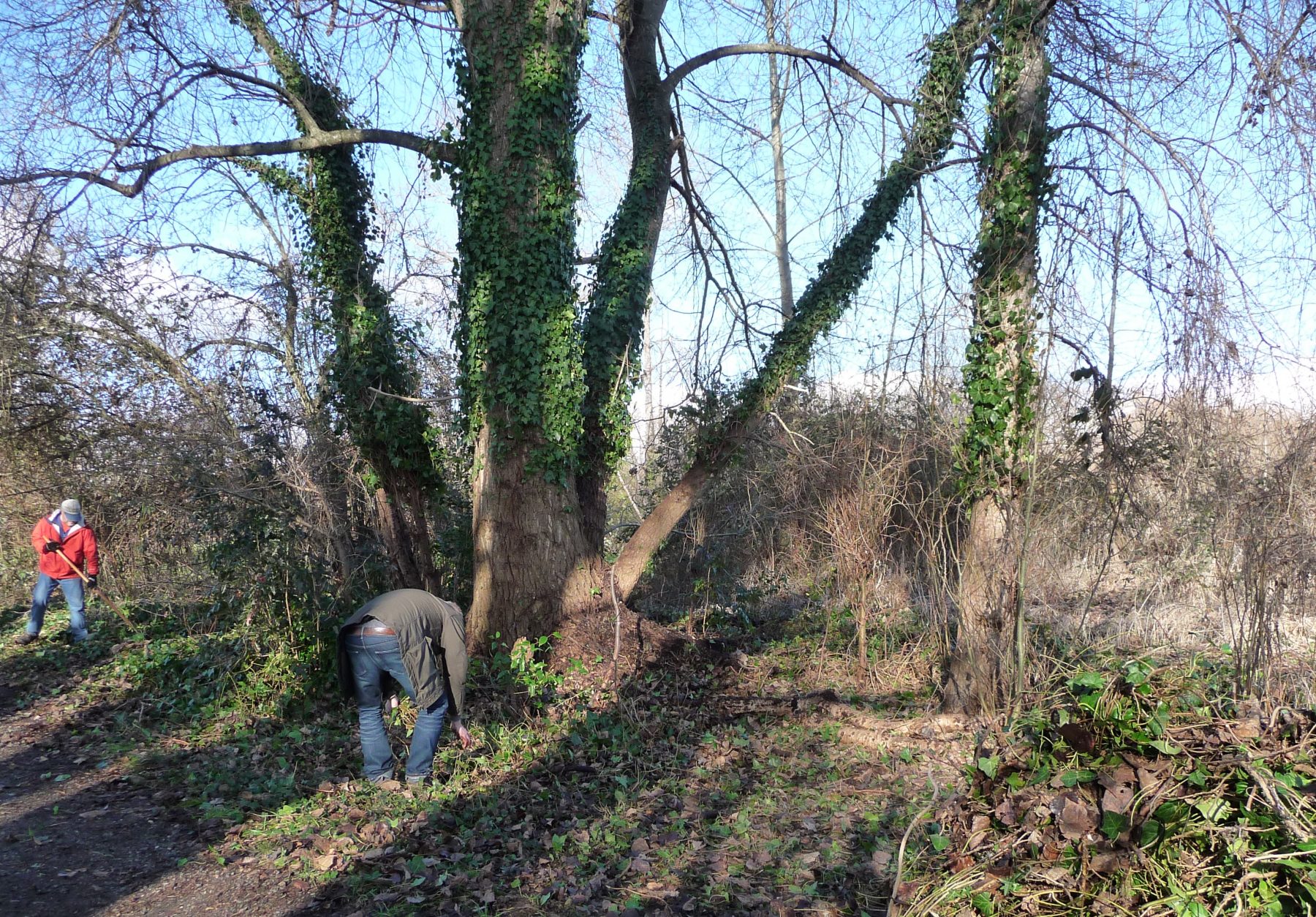 Our goal was to create “life-rings” around the impacted trees by 1) cutting ivy at a 5 ft height around the tree, 2) peeling the ivy back off the tree, and 3) digging the ivy roots out of the ground around the tree base.
