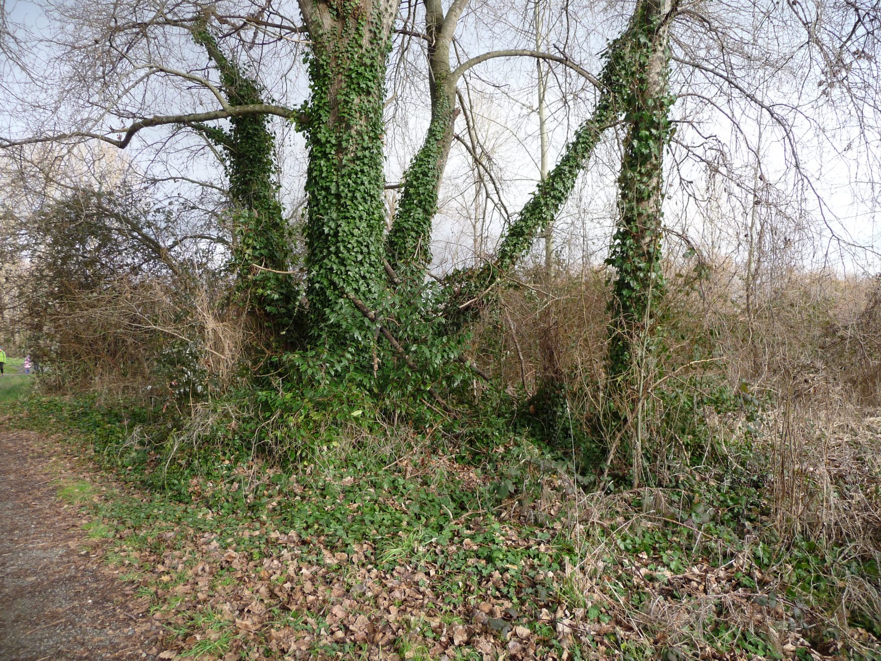 Just along the UBNA loop trail at the waterfront viewing area, many of the cottonwood trees have been suffocated by invasive English ivy. These trees may become a safety hazard for trail-users as ivy foliage weighs down branches.