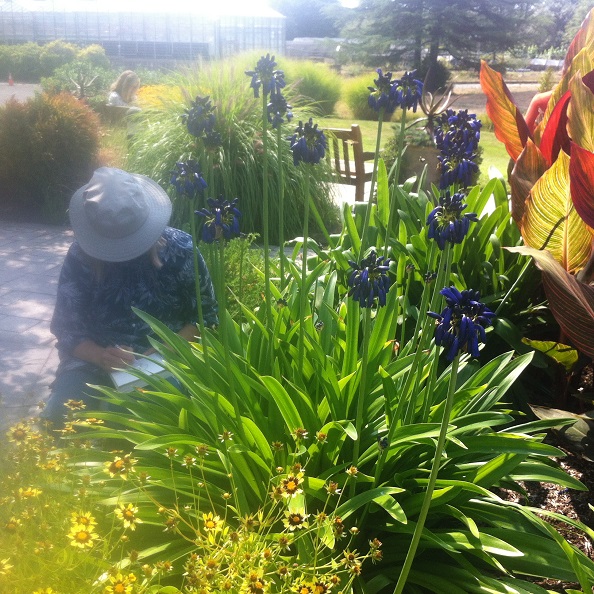 Finally my endless loop of silly thoughts were broken by the end of warm ups and Lisa’s call to go outside. We went out to the garden to observe the texture of the leaves and get some real drawing in. The gardens are absolutely lovely, with a beautiful fountain in the middle that kept my company when everyone else drew. However, before everyone scattered off to sketch, Lisa gave a quick demonstration on how she was able to draw using a permanent marker to make quick lines that formed a lovely bunch of leaves. From there, students went off and picked their own section of garden to sketch by themselves for half an hour. If only I had brought a pen I’d have been drawing too. Thankful it was a beautiful day so I wasn’t unhappy. A plaque with the phrase “unusual foliage” caught my eye. Unusual Foliage needs to be a band name. The class definitely seems like an interesting and worthy class if you love to sketch gardens, and bring paper and pen. I didn’t bring a pen. Everyone else did and they had a great time. Lisa went around checking in on people like a good teacher should. Now I realize, writing up these notes, that Lisa said she’d look out for the blog post. Whoops. Lisa, when you read this blog post know I loved the class. I was just frustrated with not sketching when I didn’t bring a pen because I thought it was against the Volunteer Write Up Crew code or something. Nah, it was really because I was too lazy to bring a pen. Is this whole blog post me complaining about a pen? I’m so sorry. Please sign up for this class, well, not this class because it’s already full, sold out, due to what a great offering it is. But Jessica notified me the Botanical Gardens are going to offer it again in the fall. Please sign up for the fall offering. I promise, anyone, no matter what your skill, can participate.
