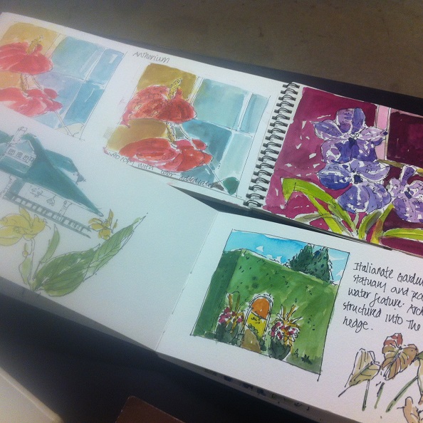 Today I showed up at the UW Botanic Gardens right at 10:00 am, to sit in on the first Botanical Sketching and Watercolor class. This class is to grow one’s skills in capturing flowers and foliage, with quick techniques and portable materials. Of course, the skills learned here can be applied to all sketching, our teacher herself isn’t an entirely landscape artist. The class looks to be of a fair price, though fortunately I got to sit in free.