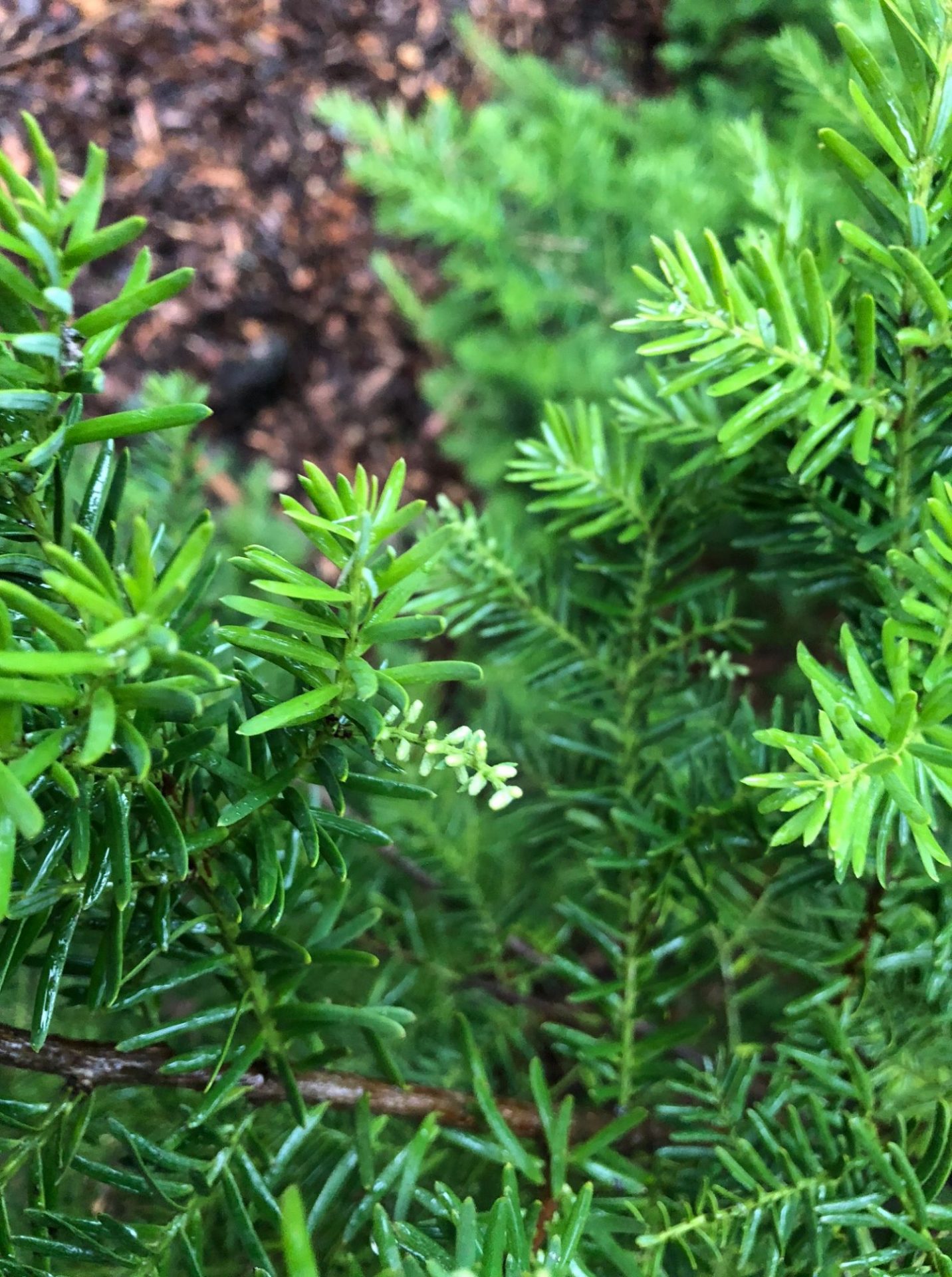 Leaves are between ¼ and 1 inches long and needle-like (though quite soft to the touch). They are alternately arrangement around the branches. They have a bluish green cast and feature two whitish stomatal bands on the undersides of the leaves. Male cones appear in small spikes in mid-winter, and some are visible now. Female cones are pale green, ripening to a purplish brown in March. The bark is smooth and grey.