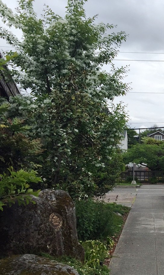 Our main specimen has been part of the Seattle Garden Club’s Fragrance Garden since 2007, and in that time has developed into a prominent small tree. It is growing on the east side of the Northwest Horticultural Society (NHS) Hall. There are several attributes of the species that make it deserving of wider use. The most notable year-round feature is its attractively peeling brown bark. Not quite as shaggy or cinnamon-colored as the paperbark maple, Acer griseum, it is nonetheless remarkable. The addition of an amazing abundance of small strap-shaped white flowers in late April through mid-May is a very ornamental feature and seems to get better with age. Flowers are lightly fragrant and held in upright panicles. This year, the effect was almost overwhelming. The plant was covered in so much bloom that the leaves were barely visible for a time. The bloom is intense and rather fleeting. The foliage is attractive, being somewhat variable from ovate to nearly round in shape. Autumn color is a pleasant yellow.