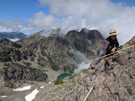 A photo of me taken by Jaileen after backpacking to camp, then hiking two more miles to the site where we found our target plants on the peak’s cliffs and set up a permanent monitoring plot.