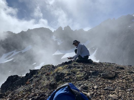 Jaileen Merced taking coordinates of the yellow mountain-avens (Dryas drummondii var. drummondii) population in the Olympic Mountains.