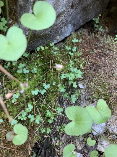 Pygmy saxifrage (Saxifraga hyperborea), plant with smaller, toothed leaves, growing out of moss at our site near Stehekin.