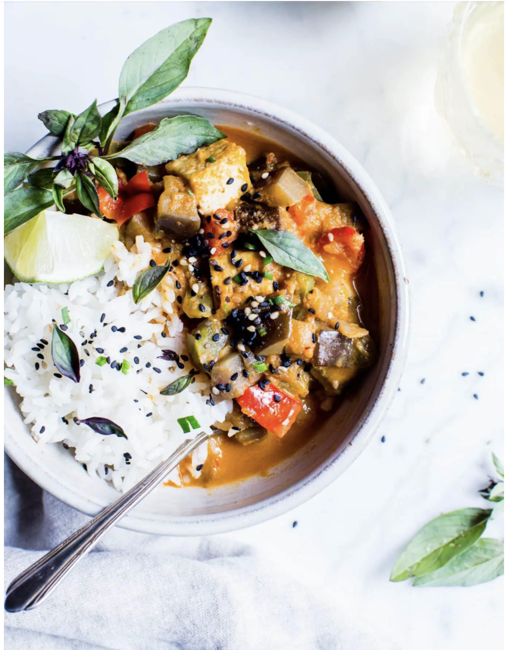 • Remove from heat and spoon over rice. Top with Thai basil, cilantro, and sprinkle with sesame seeds. Serve with additional Tamari and lime wedges.