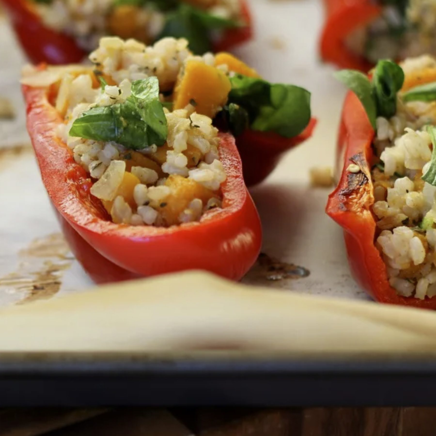 7. Taking your flipped over pepper halves, stuff them with the rice, squash, and celery root mixture.