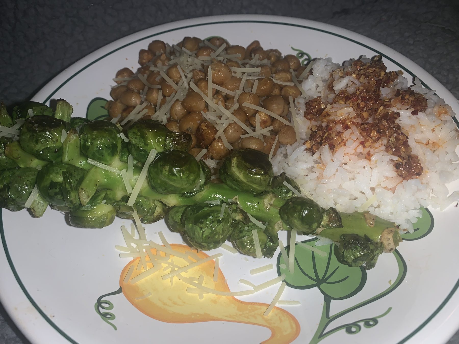 6. To plate, I left my Brussels sprouts on the stalk, but you can remove the round sprouts if you like. Top with a scoop of the cooked rice with the chile oil, soy sauce, and crispy onions and add chickpeas. Top the veggies with grated parmesan (optional).