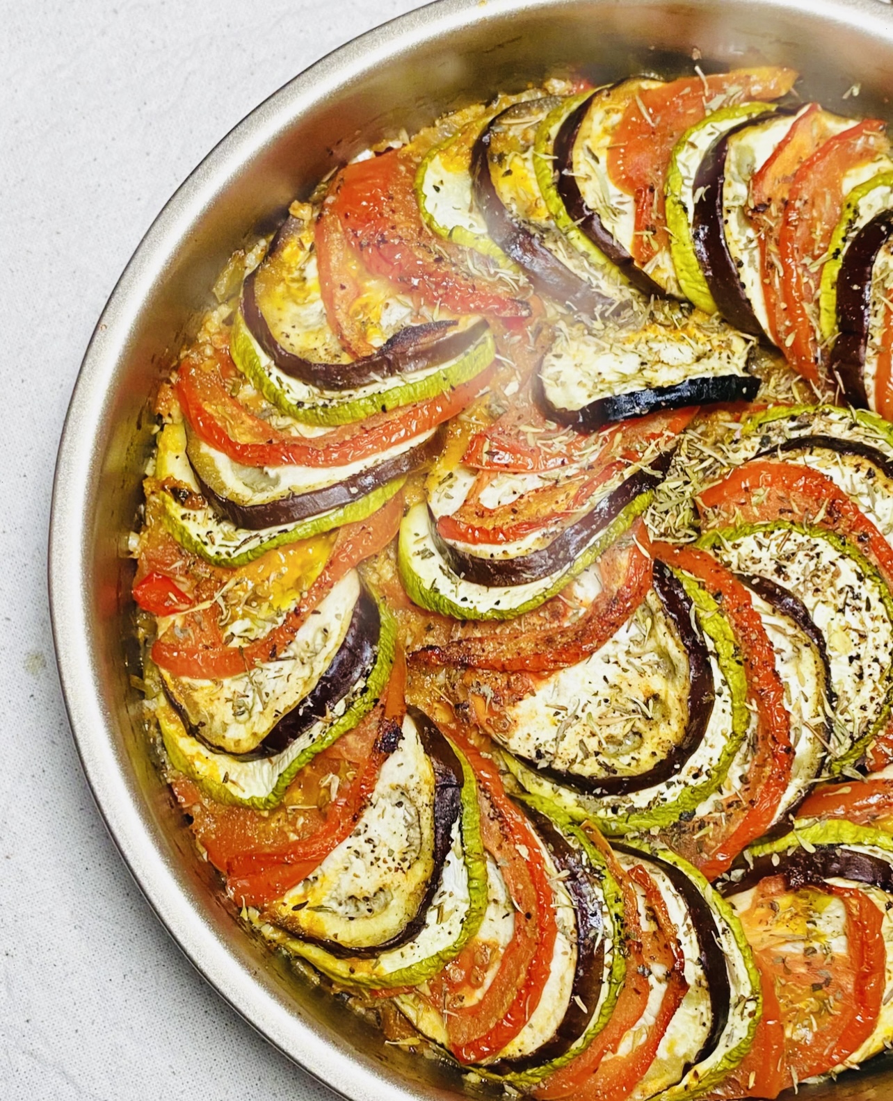 • Arrange the sliced veggies in alternating patterns, (for example, eggplant, tomato, zucchini) on top of the sauce from the outer edge to the middle of the pan. Season them again with a pinch of salt and pepper.