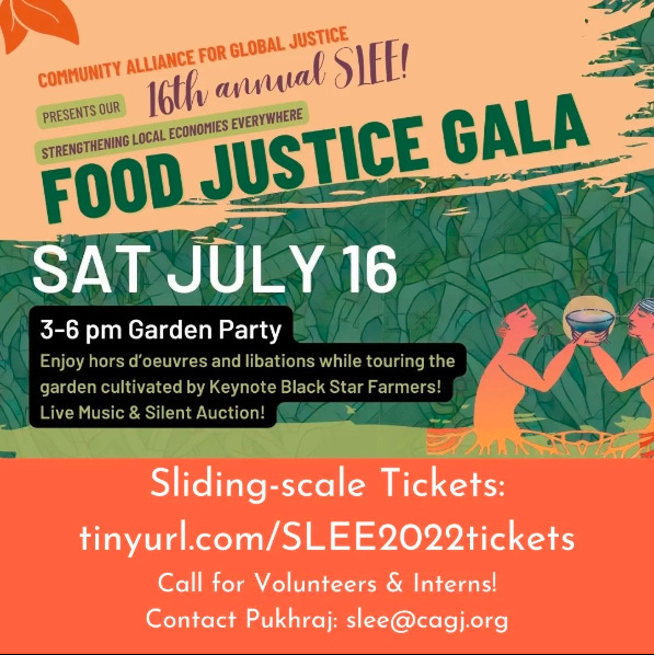 Our SLEE (Strengthening Local Economies Everywhere) Gala is just around the corner! Join us for a garden party on Saturday, July 16 3-6pm PT to help CAGJ fundraise for our yearly programming to strengthen the global Food Sovereignty movement!
