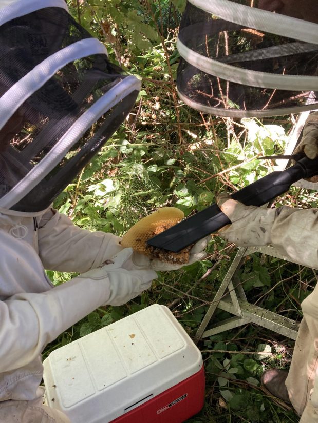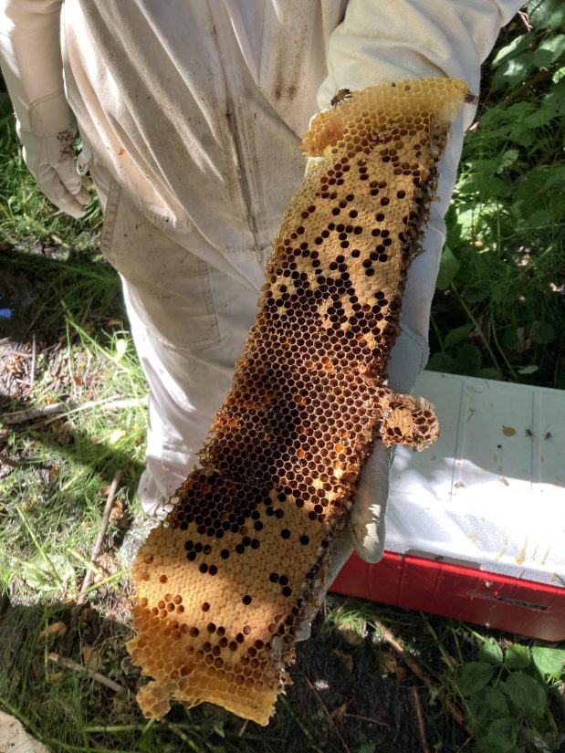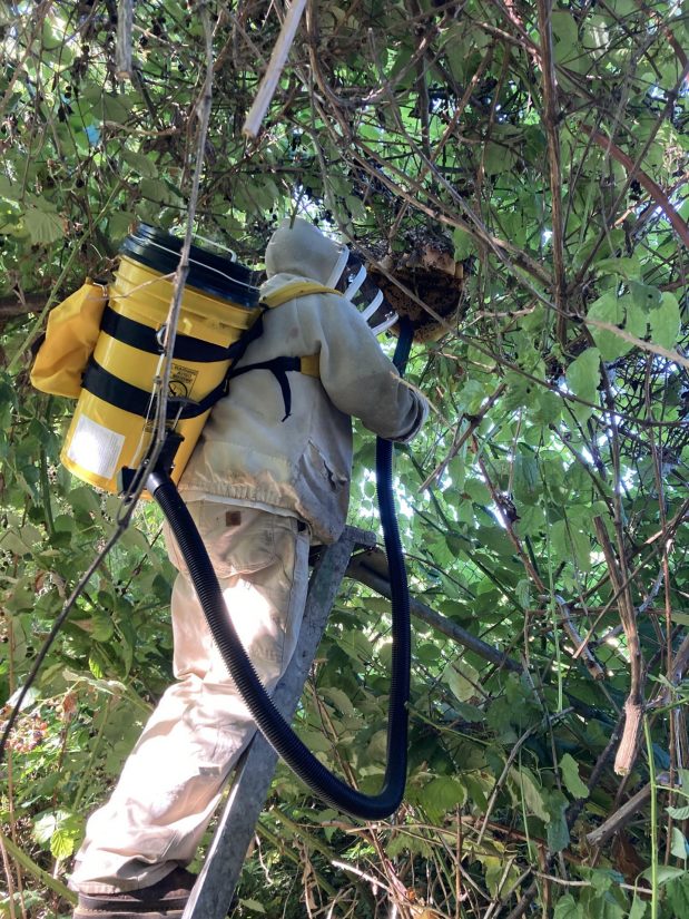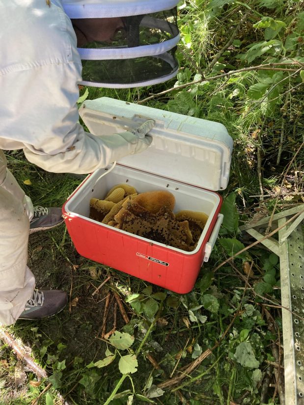 Beekeepers Paul and Pat Perkins, along with grounds staff from the Center for Urban Horticulture, brought all their equipment to the nest site. First, they carefully vacuumed the bees with a low-suction vacuum built for collecting bees humanely; then, they collected the honeycomb and broodcomb and fitted it into frames to put into a standared beehive box. They found the queen bee and secured her into a special cage to keep her safe. Finally, all bees, broodcomb, honeycomb, and queen were moved together to an apiary at a farm in the Snoqualmie Valley; the hive has a great chance to survive and thrive in its new location.