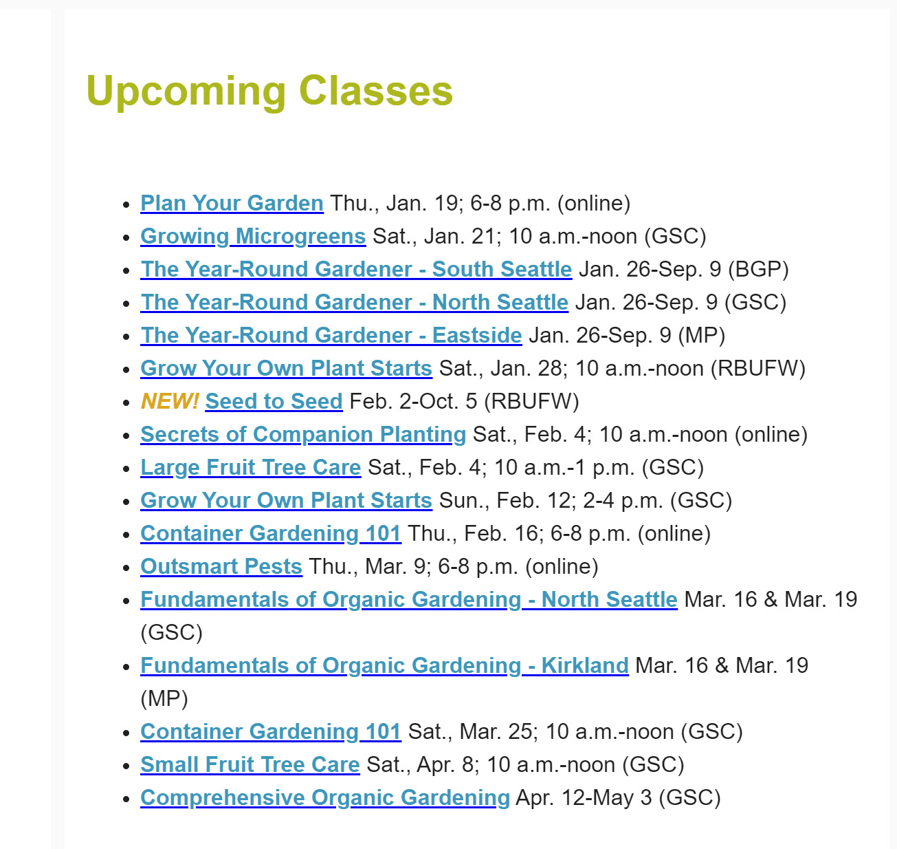 With an overall focus on limited space/resources, and the combined challenges of western Washington weather and soils,  this series of speakers and topics will help beginners, as well as long time gardeners, l