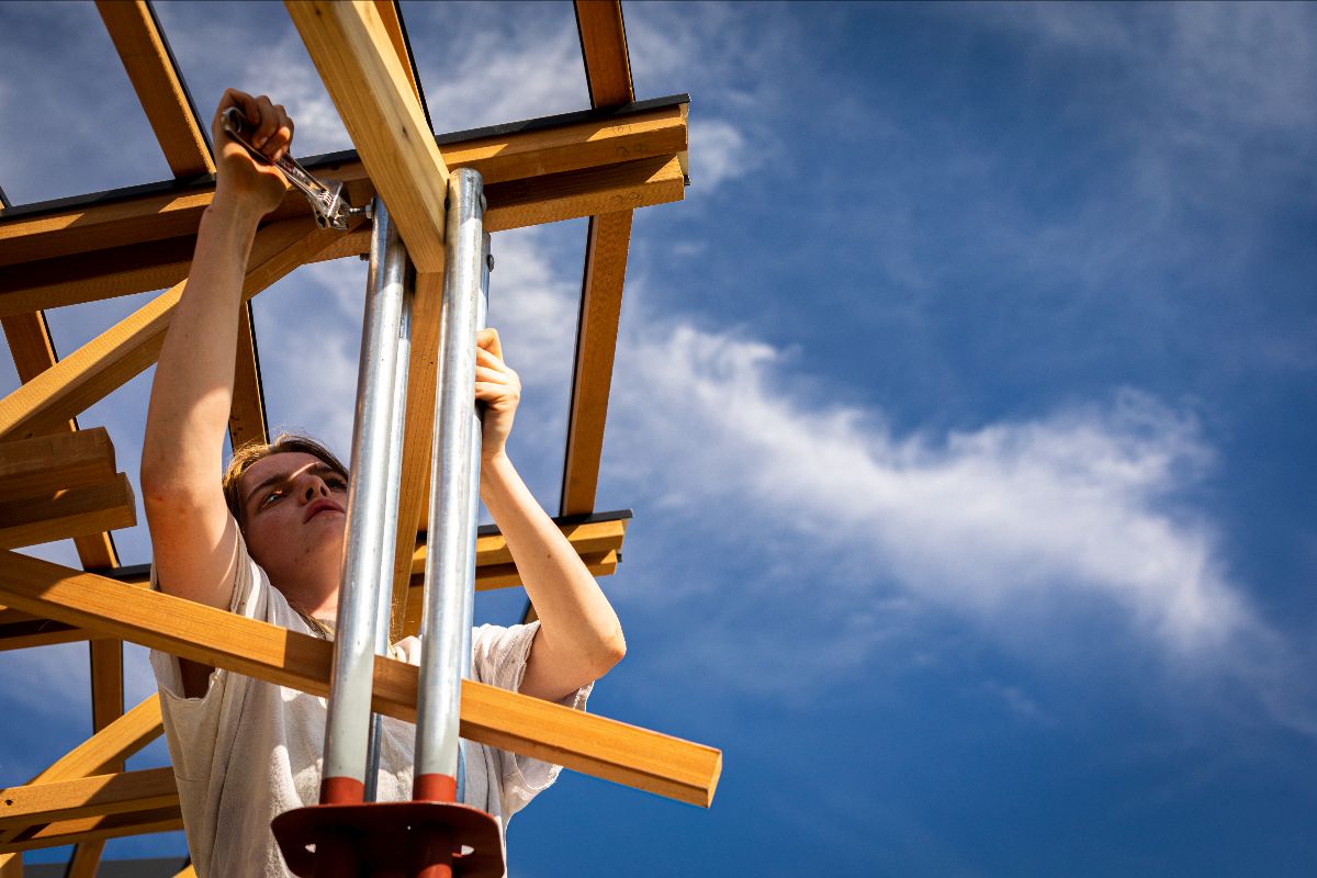 The recently completed structure was completed from design to finish by students during the 10-week Spring academic quarter. The concept for the structure was a building that brings people together, outdoors, and is welcoming, open to all. The result is a pavilion-like arbor, or a donut…”but with a bite taken out of it,” said one student in the course.