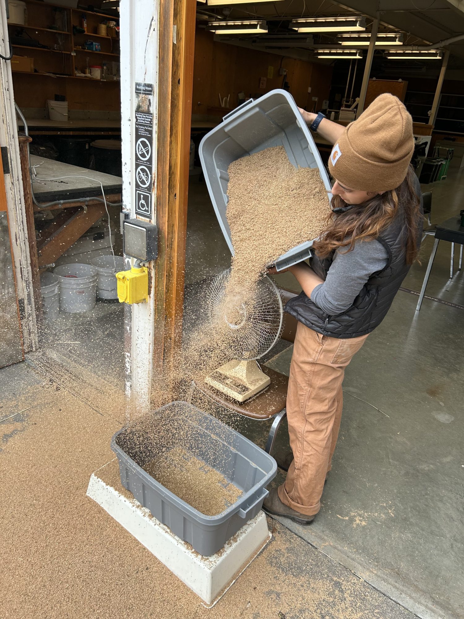During a lab with Harvest to Health, we took our dried bags of quinoa stalks down from the celling of the high tunnel and carefully removed the stalks from the seed pods with scissors and gardening snips. We collected the seeds and chaff into food-safe 5-gallon bucks to be threshed (shown in the photo left). The threshing process can be done in many ways. The big picture is to release the seeds from the dried flowers or seed coat (chaff) with massage or agitation.  The method we chose was to rub a handful of quinoa between our hands, which massages the seeds out of the chaff. After we did this step until we felt confident that we had removed as many seeds from the chaff as we possibly could, we moved onto the winnowing step. Winnowing removes the chaff from the seeds. The best way to achieve this result is to utilize wind power and blow the chaff (which is much lighter in weight) off the seeds. To do this, we used fans and slowly poured our collection of seeds and chaff in front of a running fan (see photo right). Quinoa seeds are heavier than the chaff, and the fan will blow the lighter chaff away, so only seeds fall into the harvest tote below. We did this a number of times to ensure we separated as much chaff as possible.