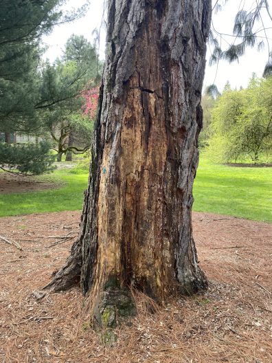 In 2022 Arthur Lee Jacobson reached out to our arborist team concerned about the health of the tree. A few small wounds were found at the base of the trunk, and we brought in an outside consulting arborist company, Tree Solutions, to conduct more advanced testing including sonic tomography. Sonic tomography is a relatively new technology that uses sound waves to create a three-dimensional model of the interior of a tree. This testing revealed a column of decay from the base of the tree extending upwards to nine feet high. The consultants deemed the pine still structurally sound and low risk, but recommended continued close monitoring of the tree, including looking for fungal signs such as mushrooms, conks, or mycelium.