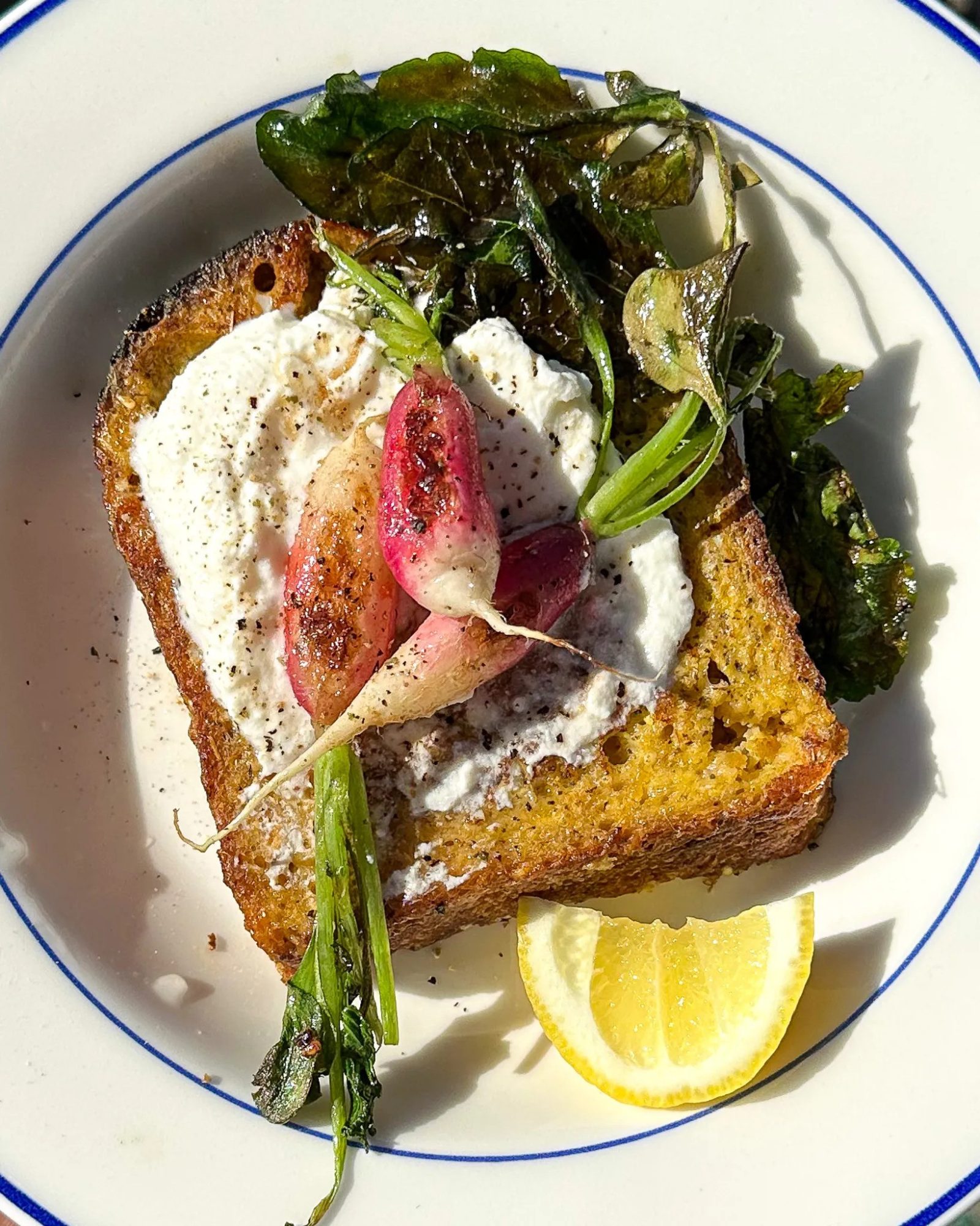 Add the French toast to a plate and swoosh the ricotta (or vegan cream cheese) on top. (I love a swoosh) Pile on the radishes! Finish with a squeeze of lemon and a few cracks of black pepper.