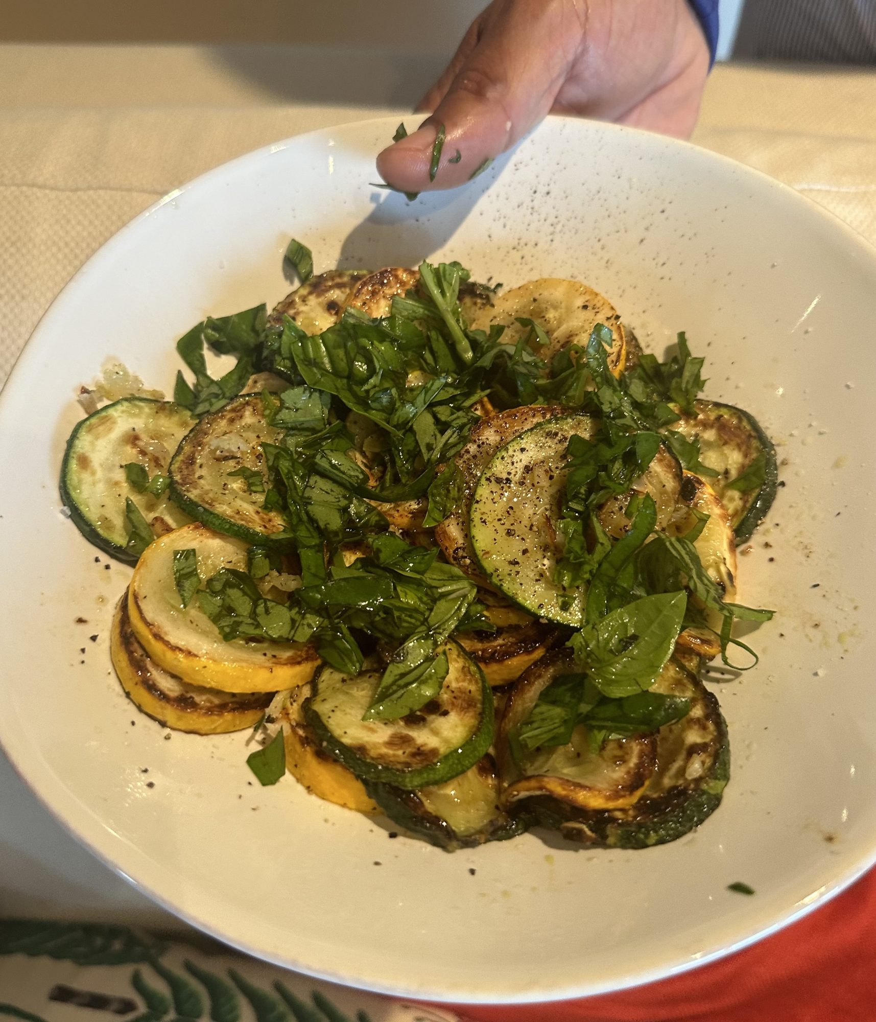 After my farm shift last week, I was able to bring home ingredients and make a meal. I made summer squash, seared and seasoned with basil, salt and pepper (see photo, right).