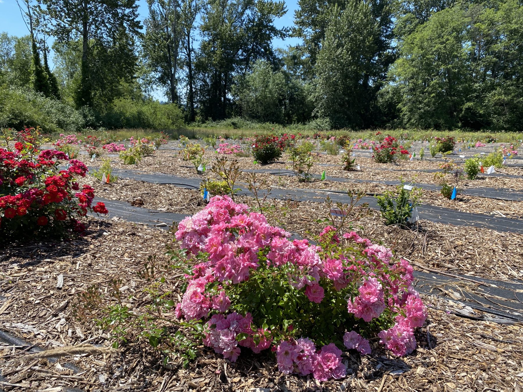 Rosa Petite Knockout was bred to be a compact rosebush with smaller flowers. This rose blooms throughout the summer and has dark red/pink flowers. You can learn more about this plant here.