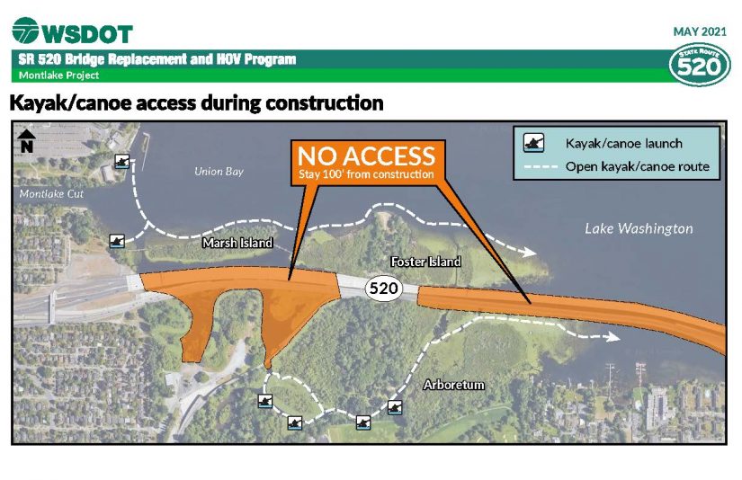 With warm weather upon us, we want to reminder you of the revised water access and navigation routes in and around Union Bay and Lake Washington during construction of the SR 520 Montlake Project. The map below shows the construction zone for work that will continue through 2023. Please stay 100 feet from construction activities.